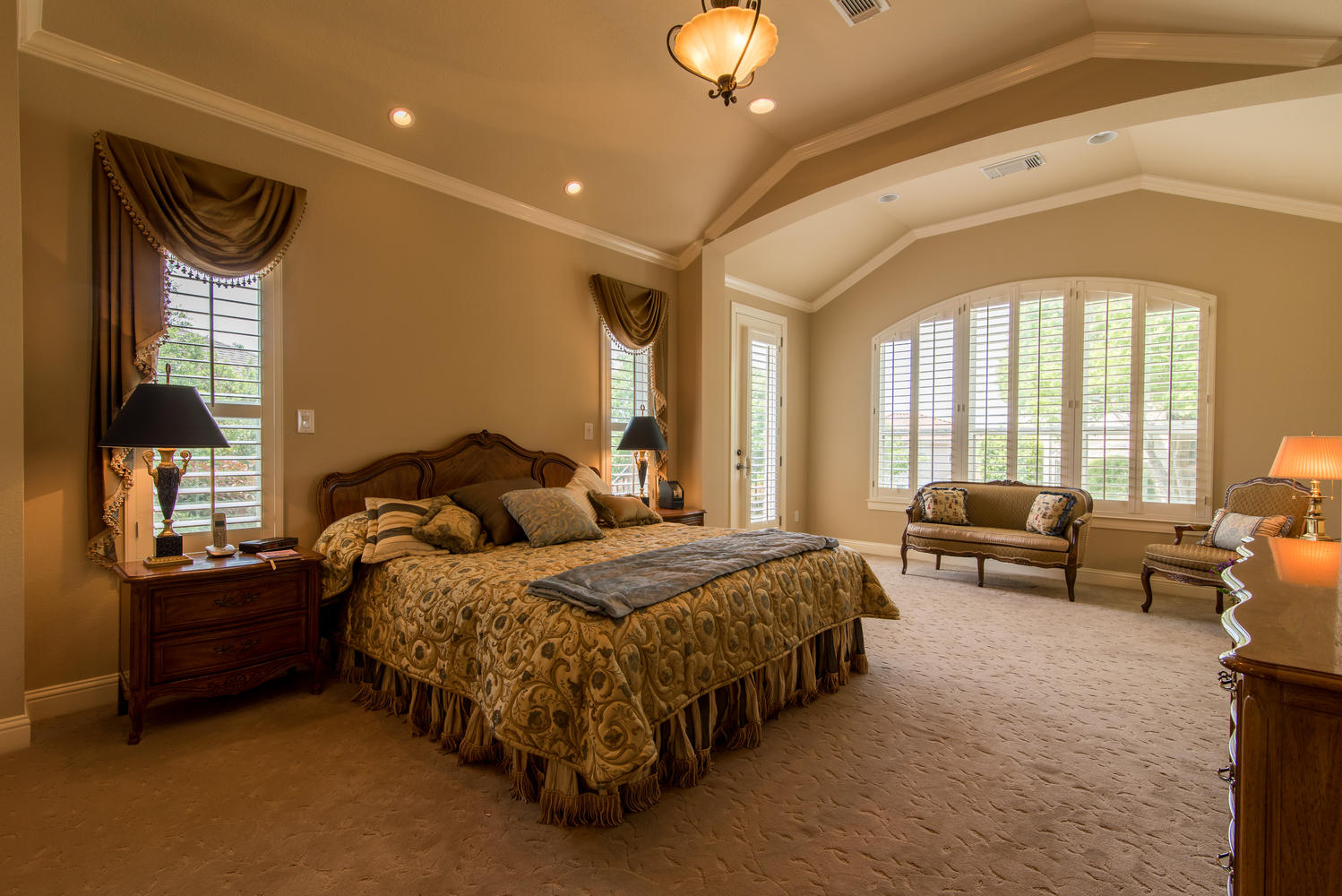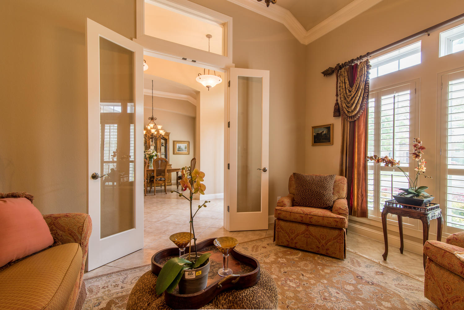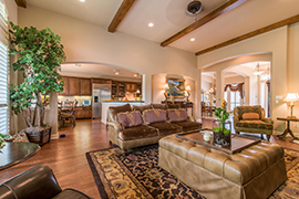 on the second floor of the home. The interior boasts a dramatic open living area with high beamed and coffered ceilings, deep crown moldings, open and bright floor plan with walls of windows,