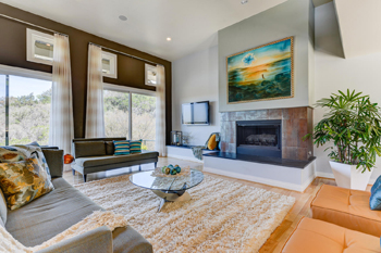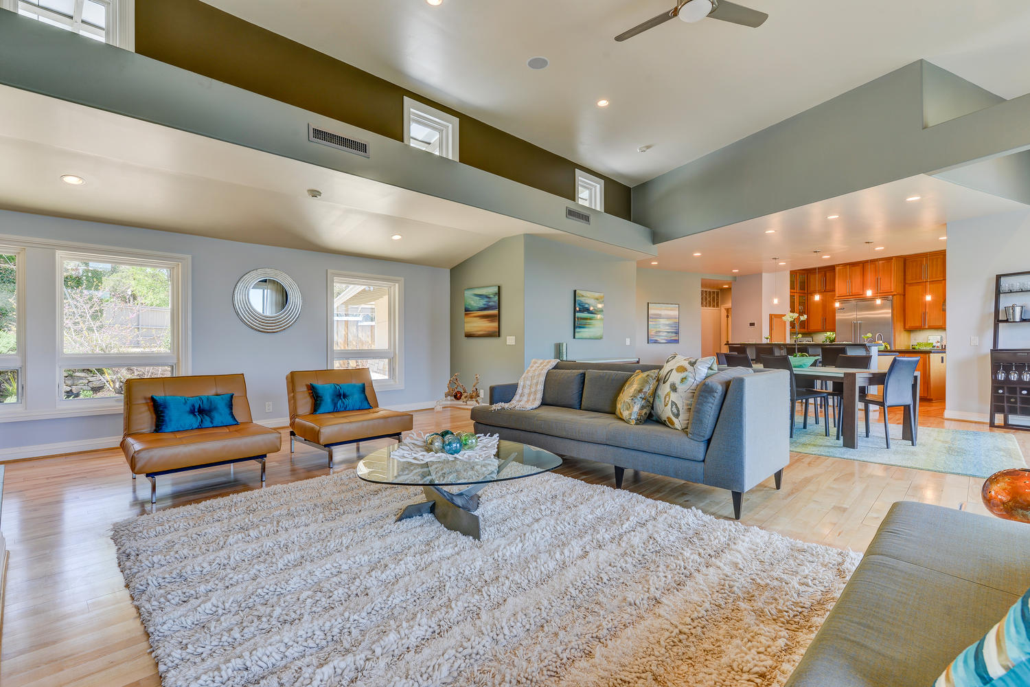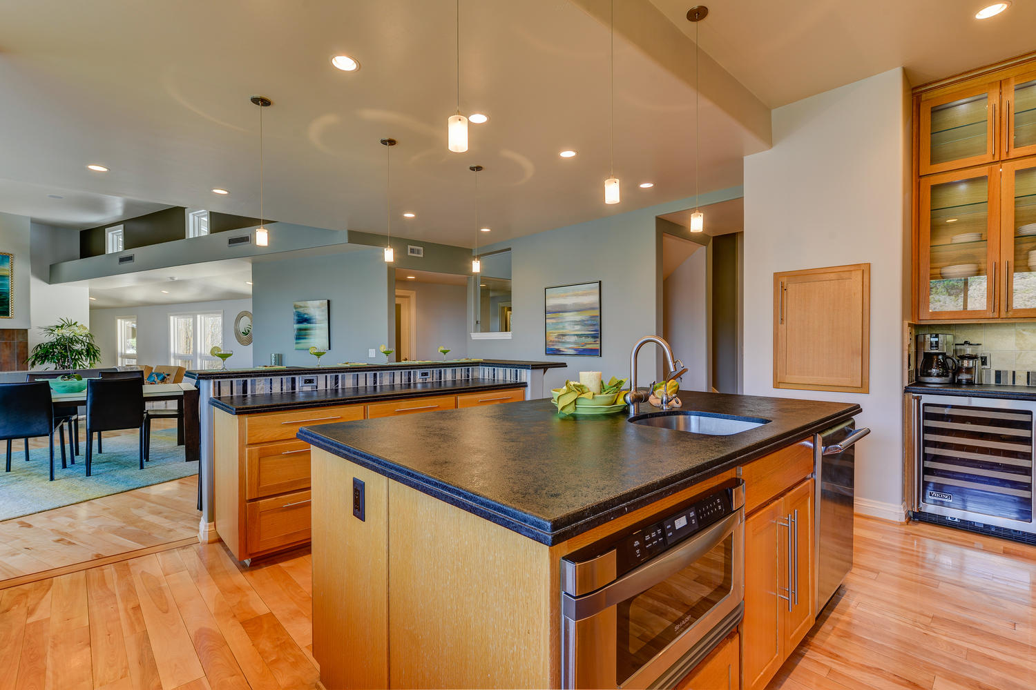 - Extensive great room with modern ceiling angular treatments is open to dining and gourmet kitchen with walls of windows bringing the views in