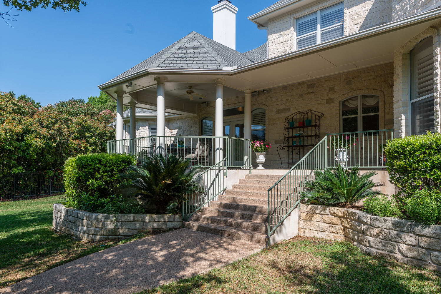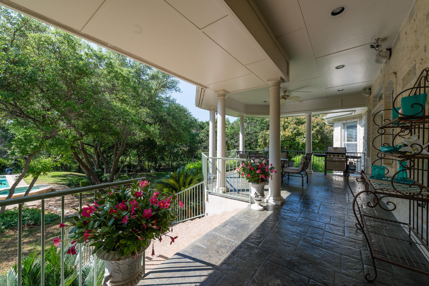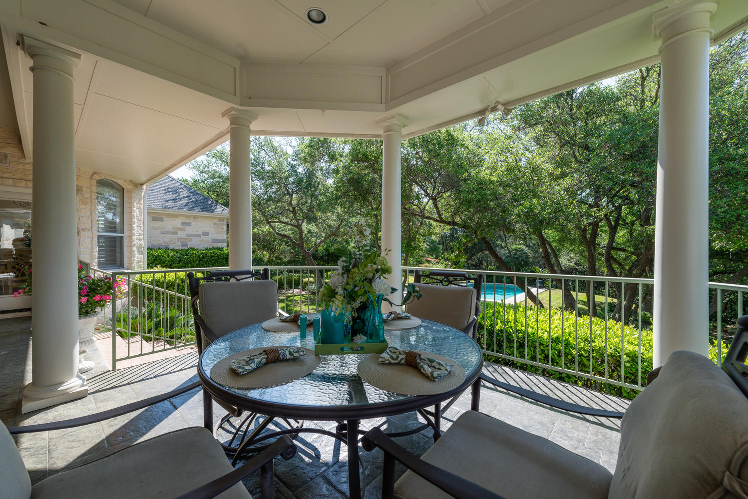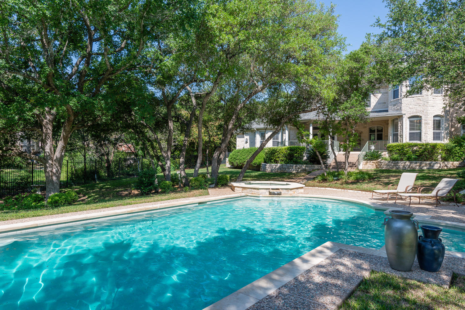 - Outstanding landscaped wooded and private lot with extensive outdoor living areas – pool, spa, covered veranda, stone terraces all backing to an extensive green area.