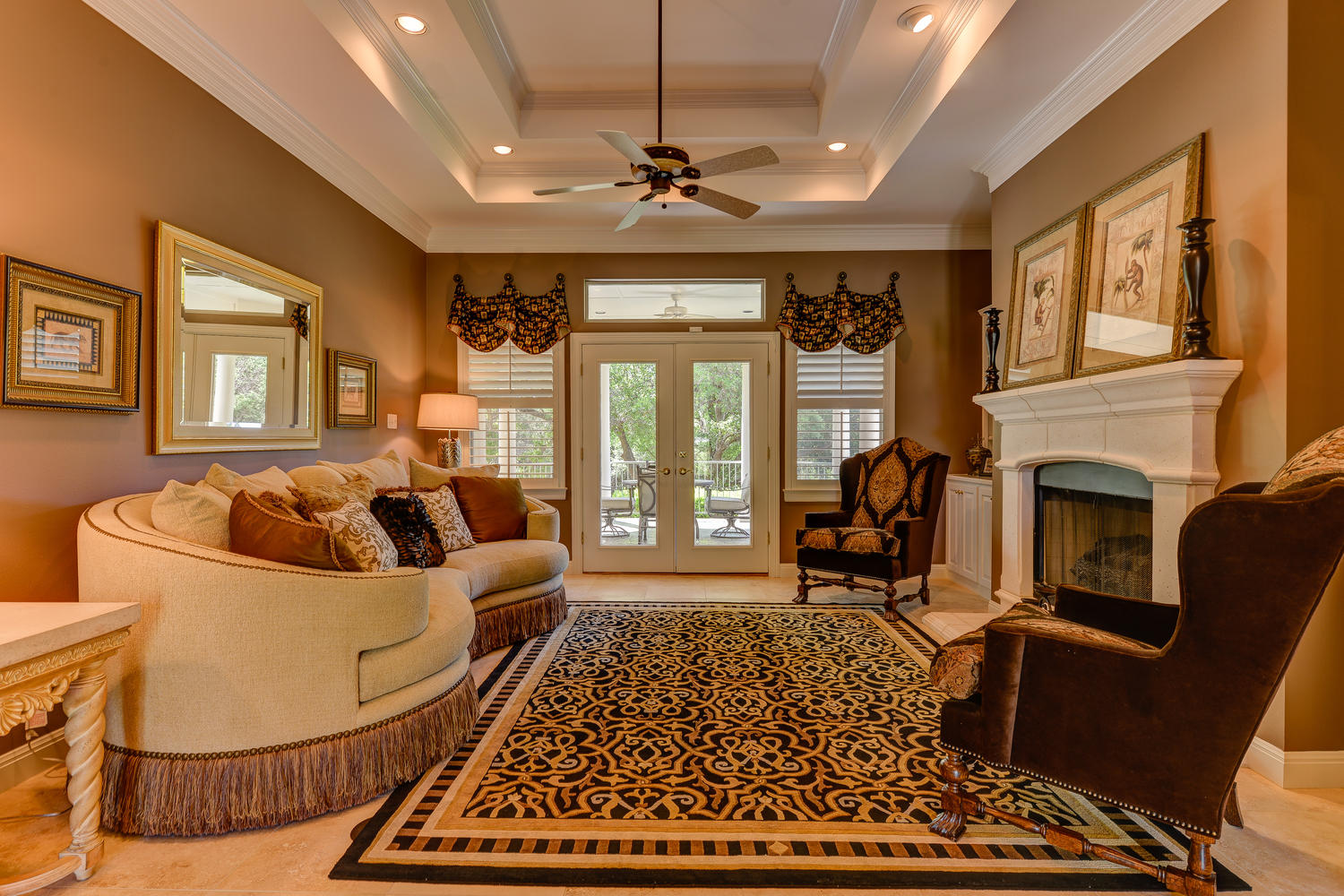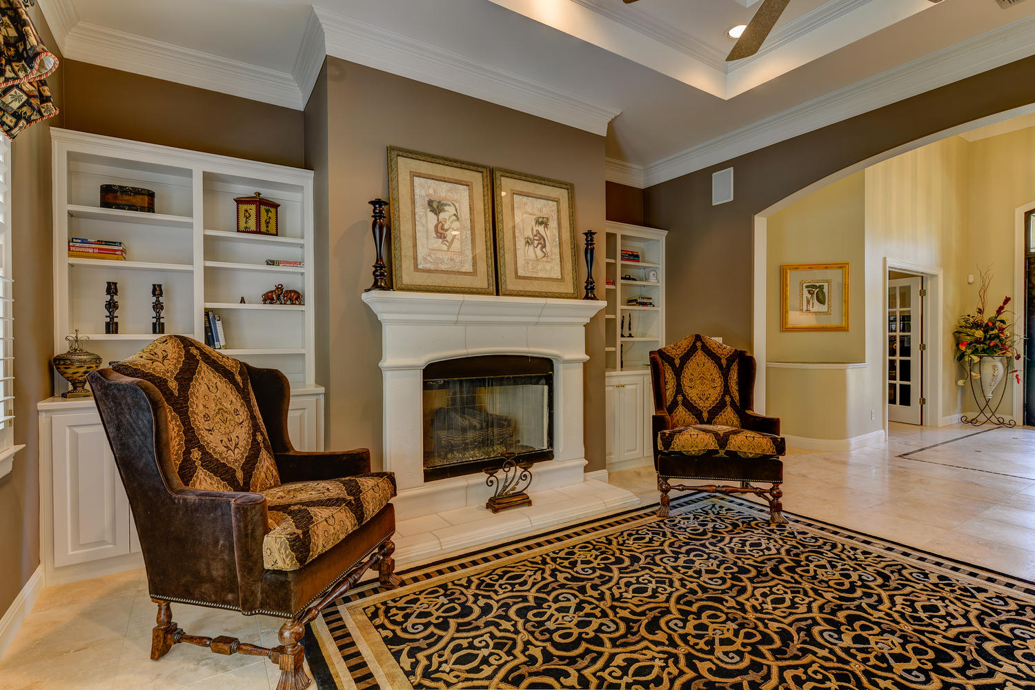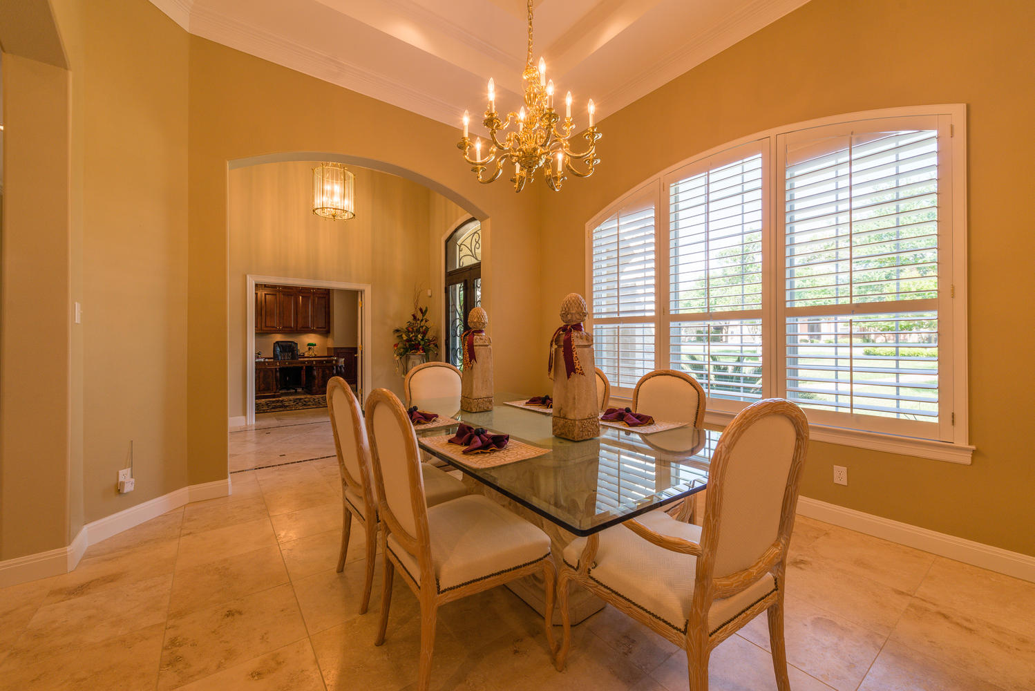 - Deep crown moldings, coffered high ceilings