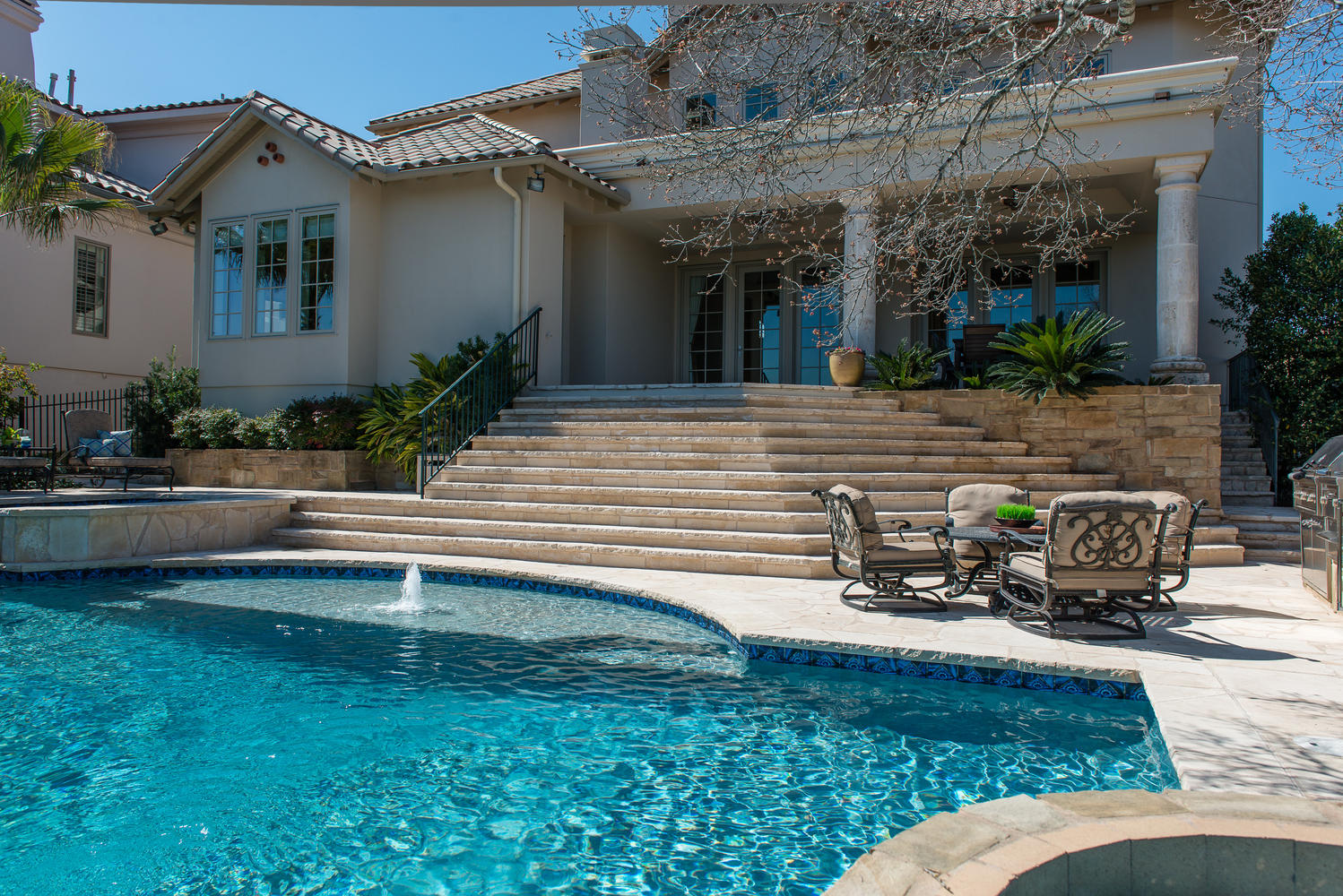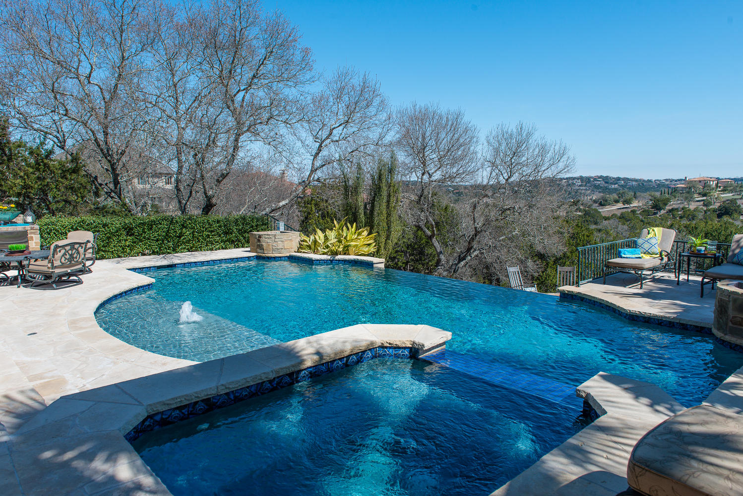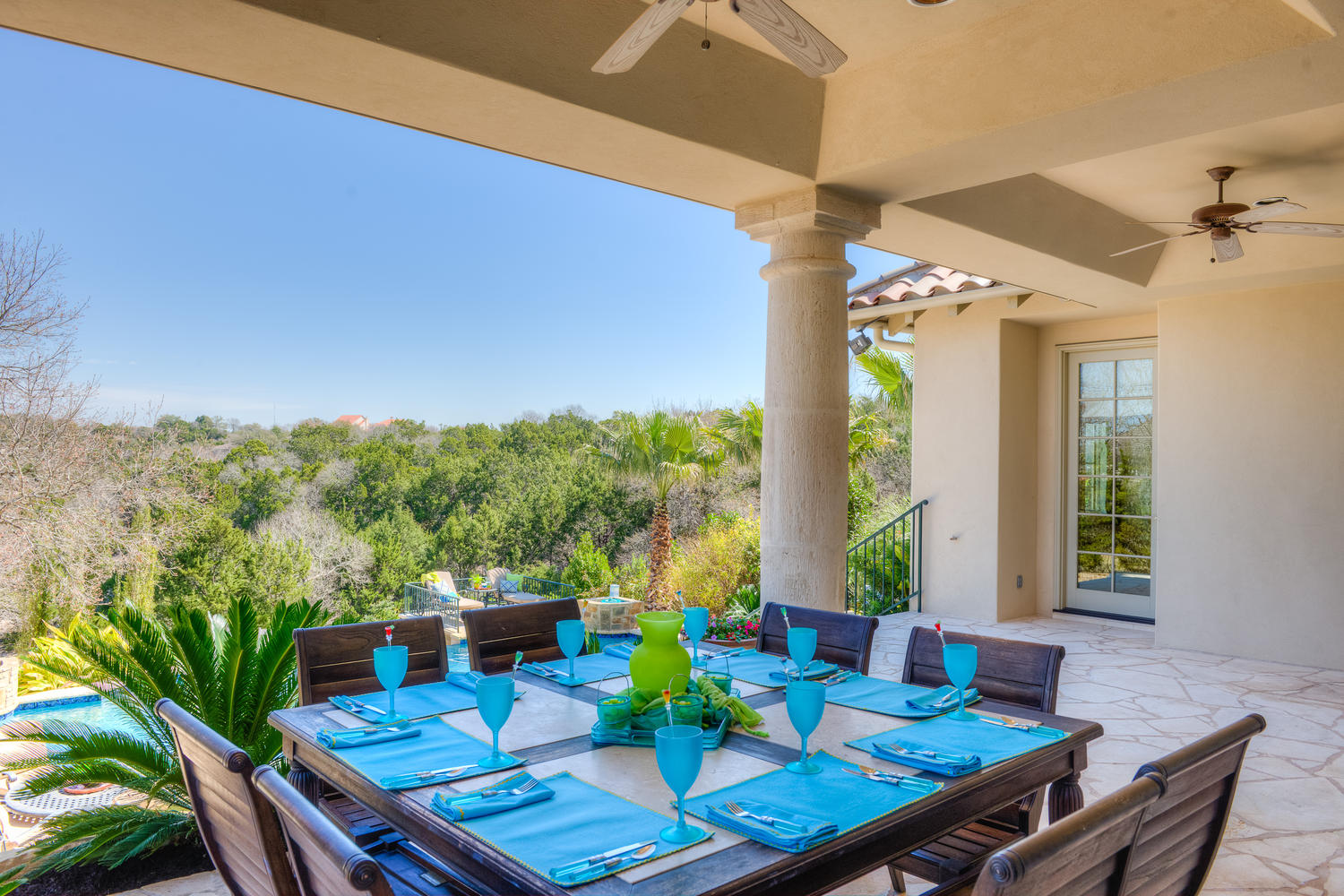 country views! Guests are greeted with a dramatic entry, formal living with stone fireplace and outdoor access to the covered porch, terraced negative edged pool,