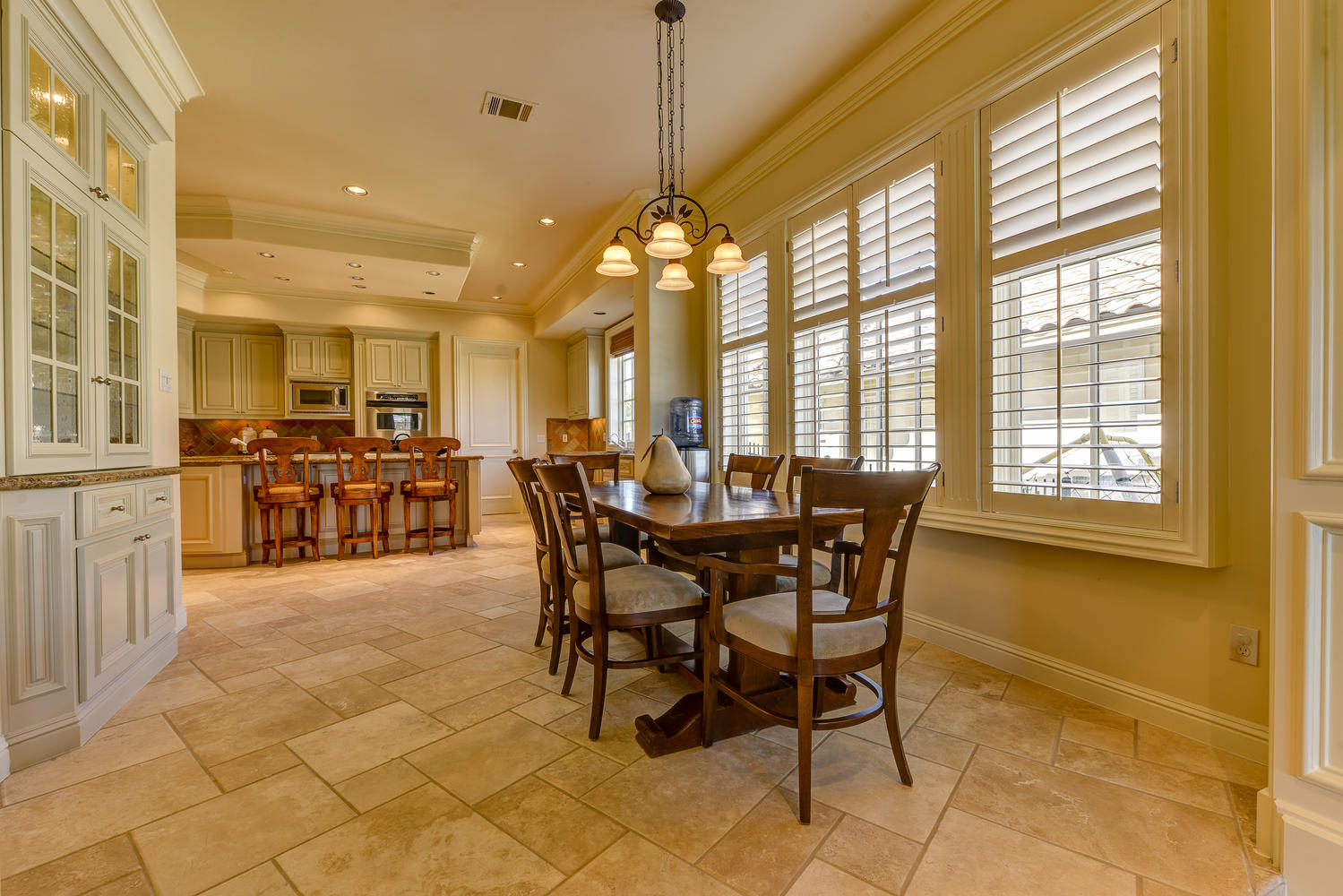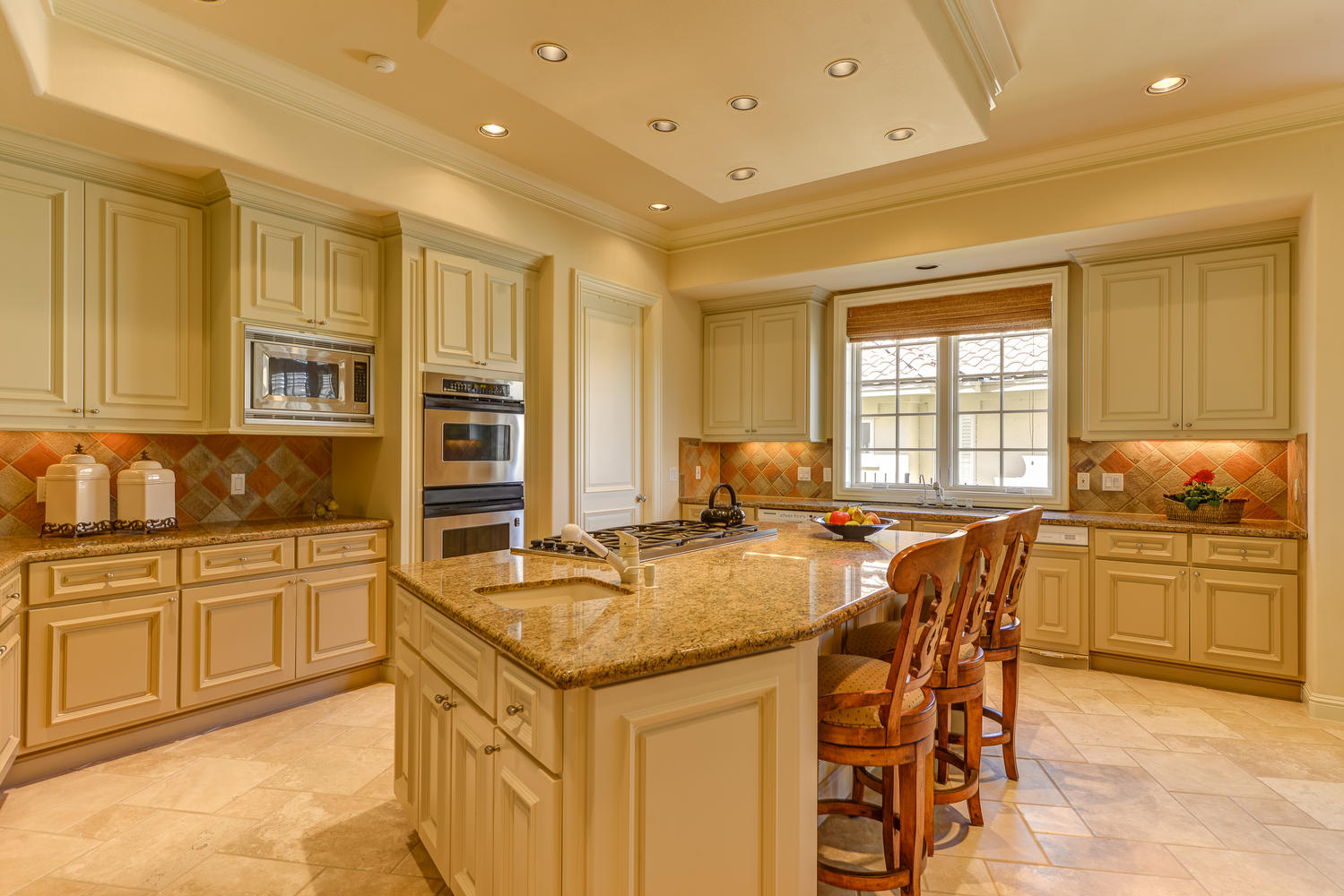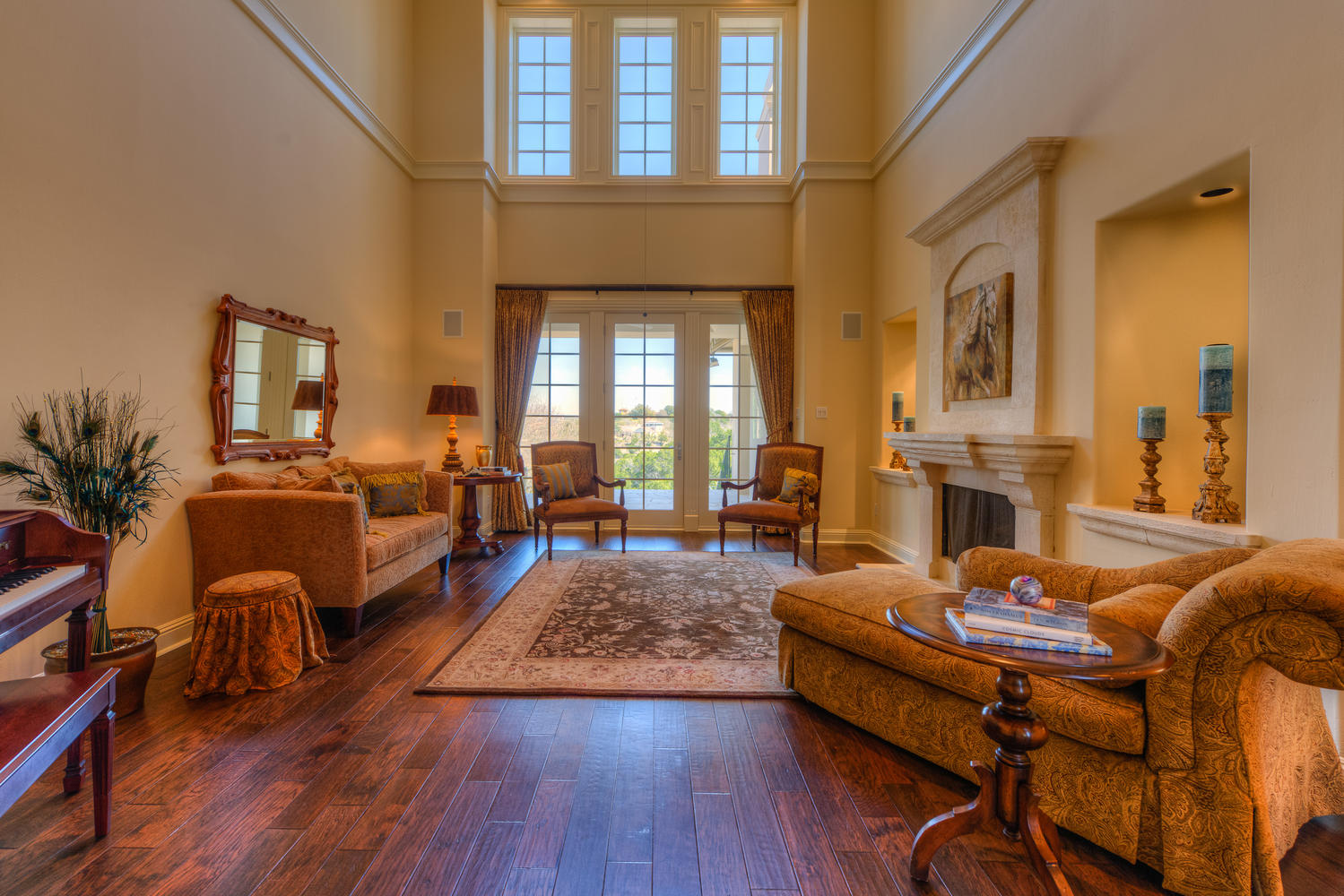 country views! Guests are greeted with a dramatic entry, formal living with stone fireplace and outdoor access to the covered porch, terraced negative edged pool,