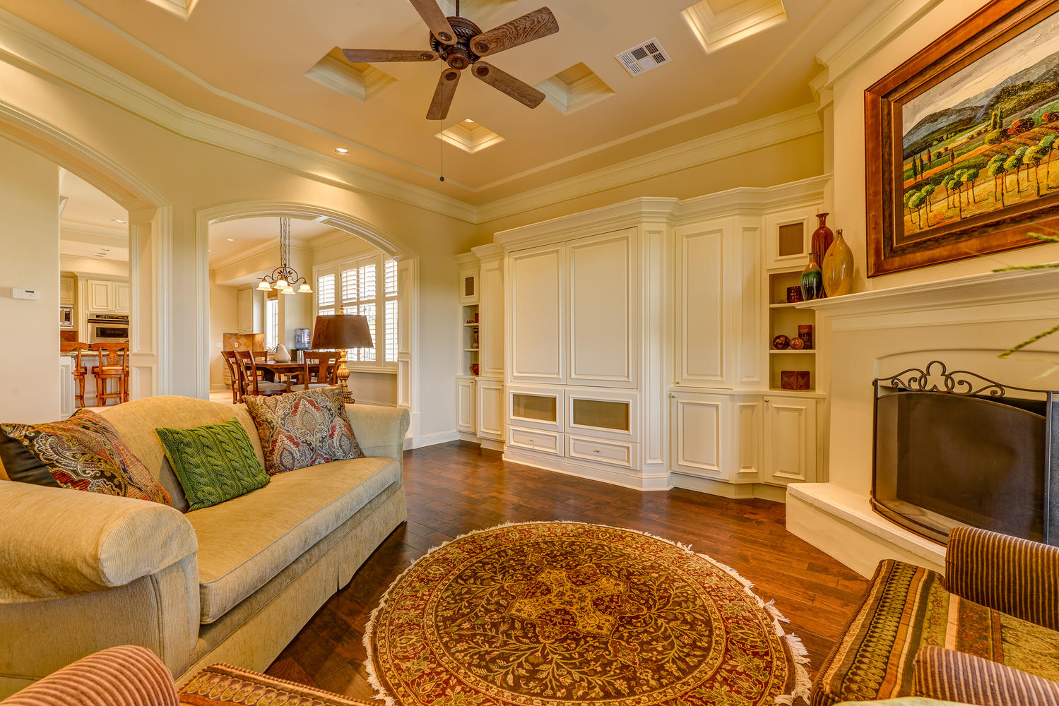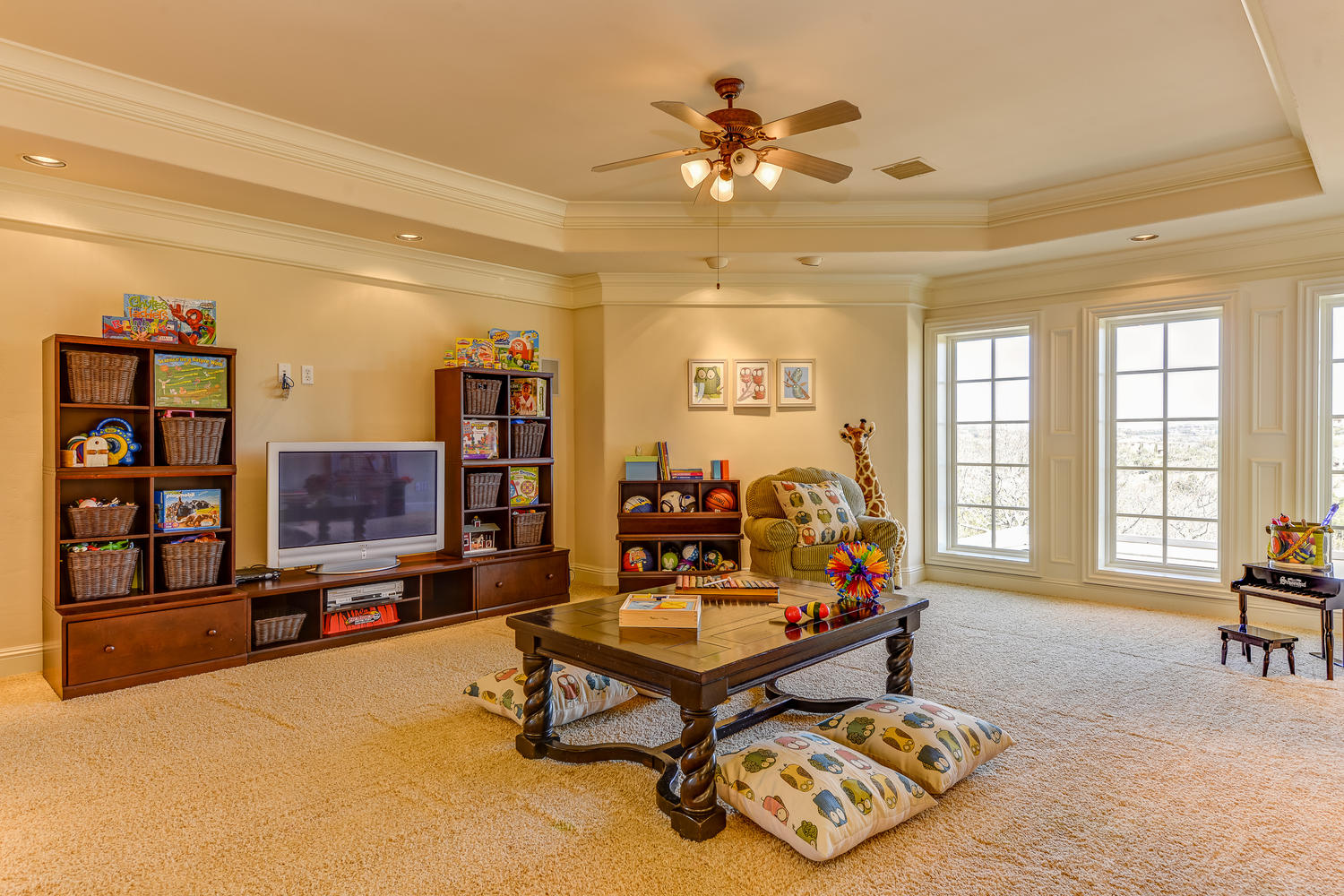 bedrooms and large game/media room. The home offers high vaulted and barreled ceilings with special cove accent lighting and deep crown moldings.