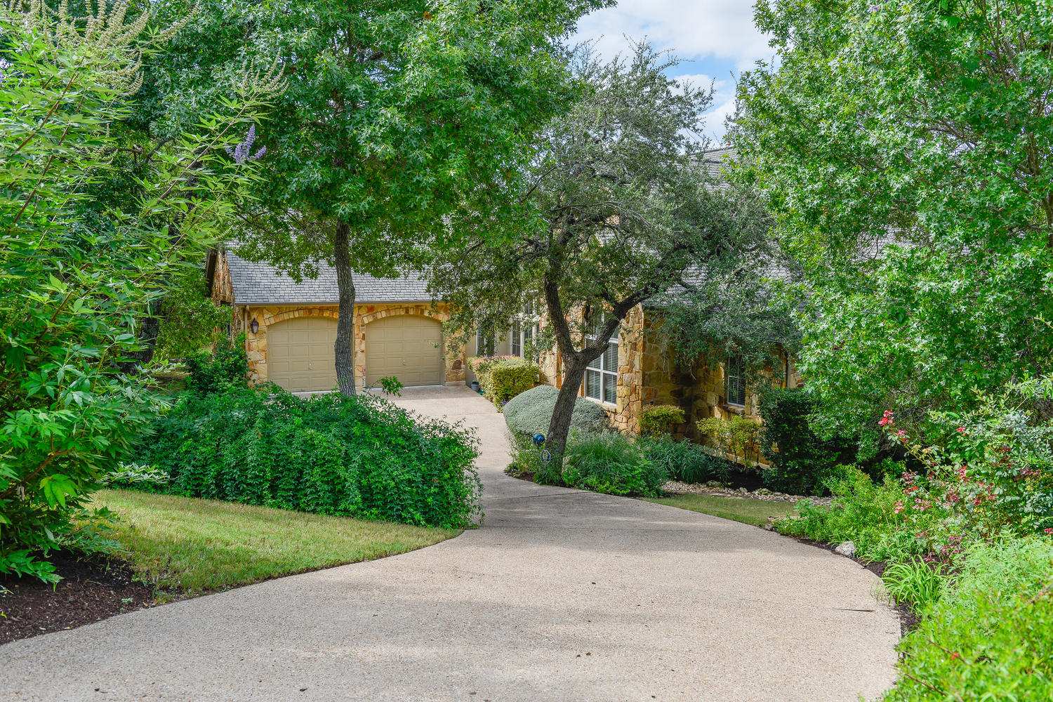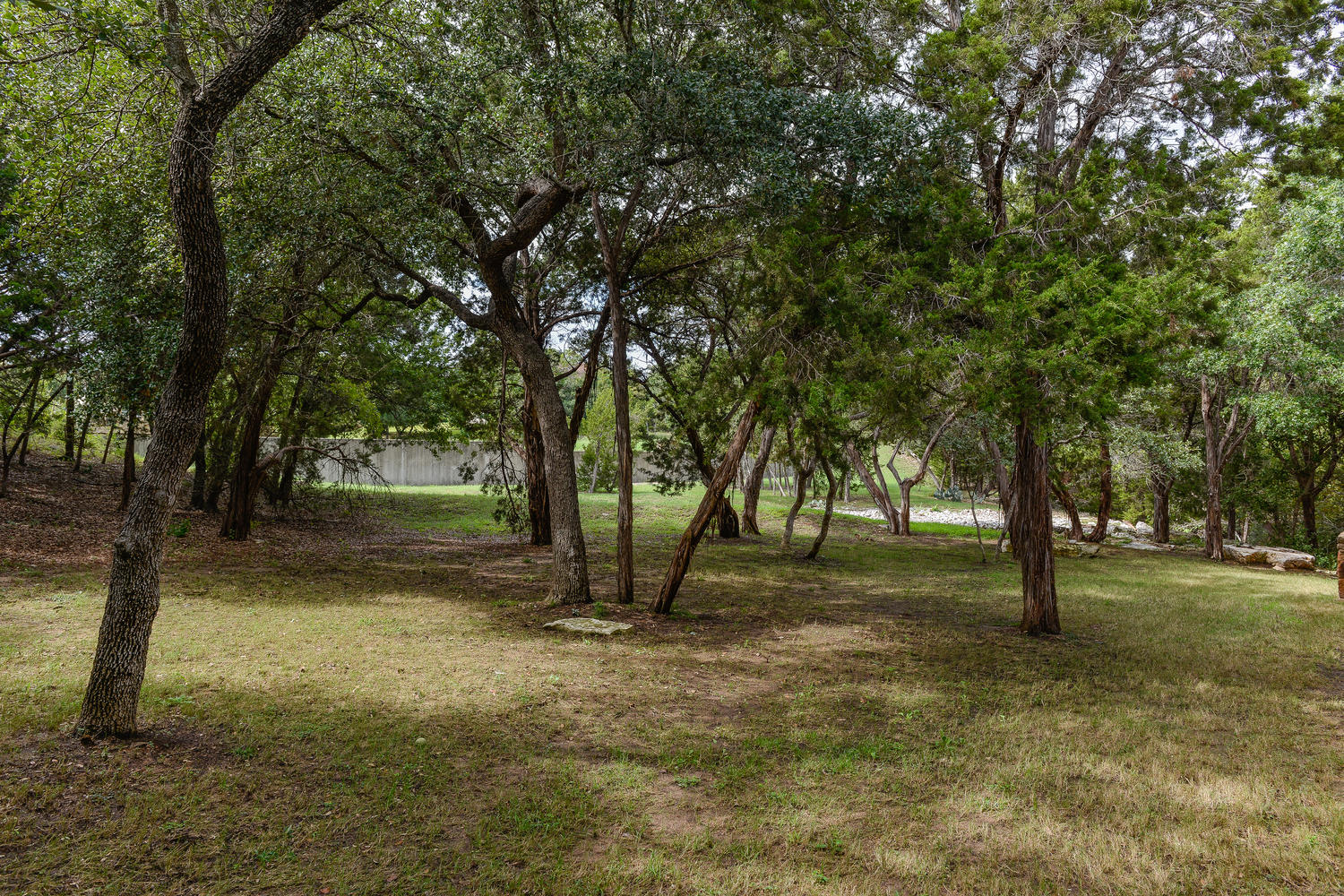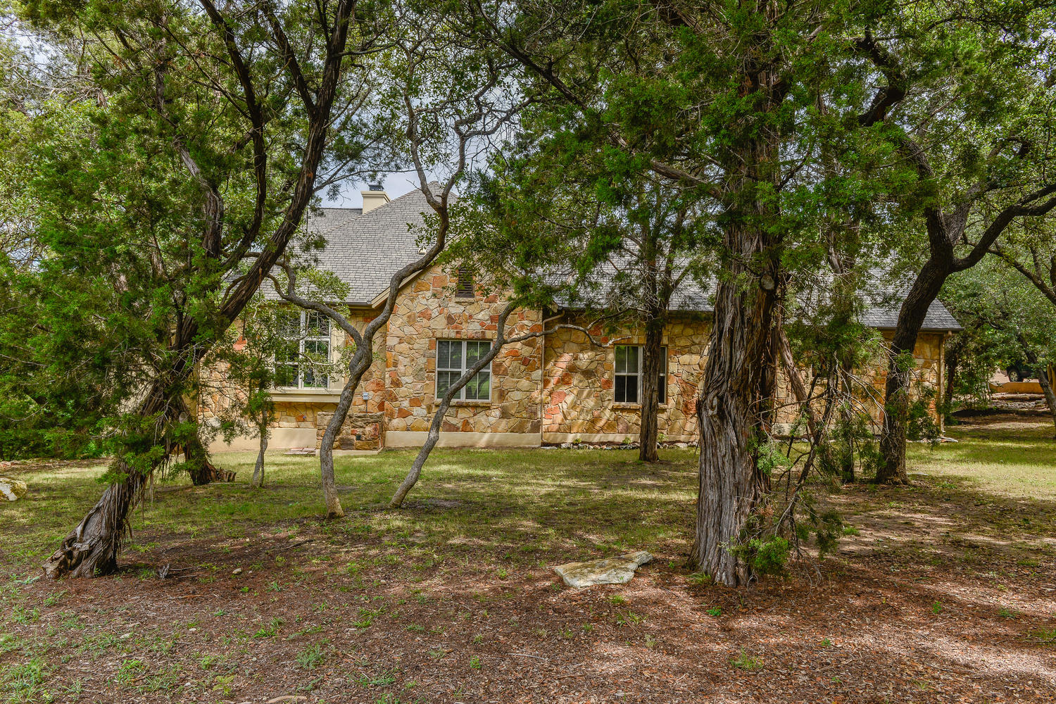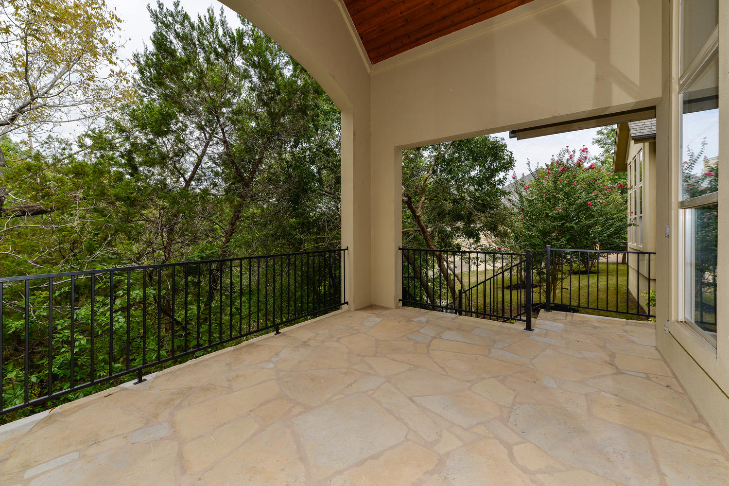 floor plan with views of the wooded greenbelt, high coffered ceilings, walls of windows, formal living & dining room, stone fireplace, gourmet kitchen